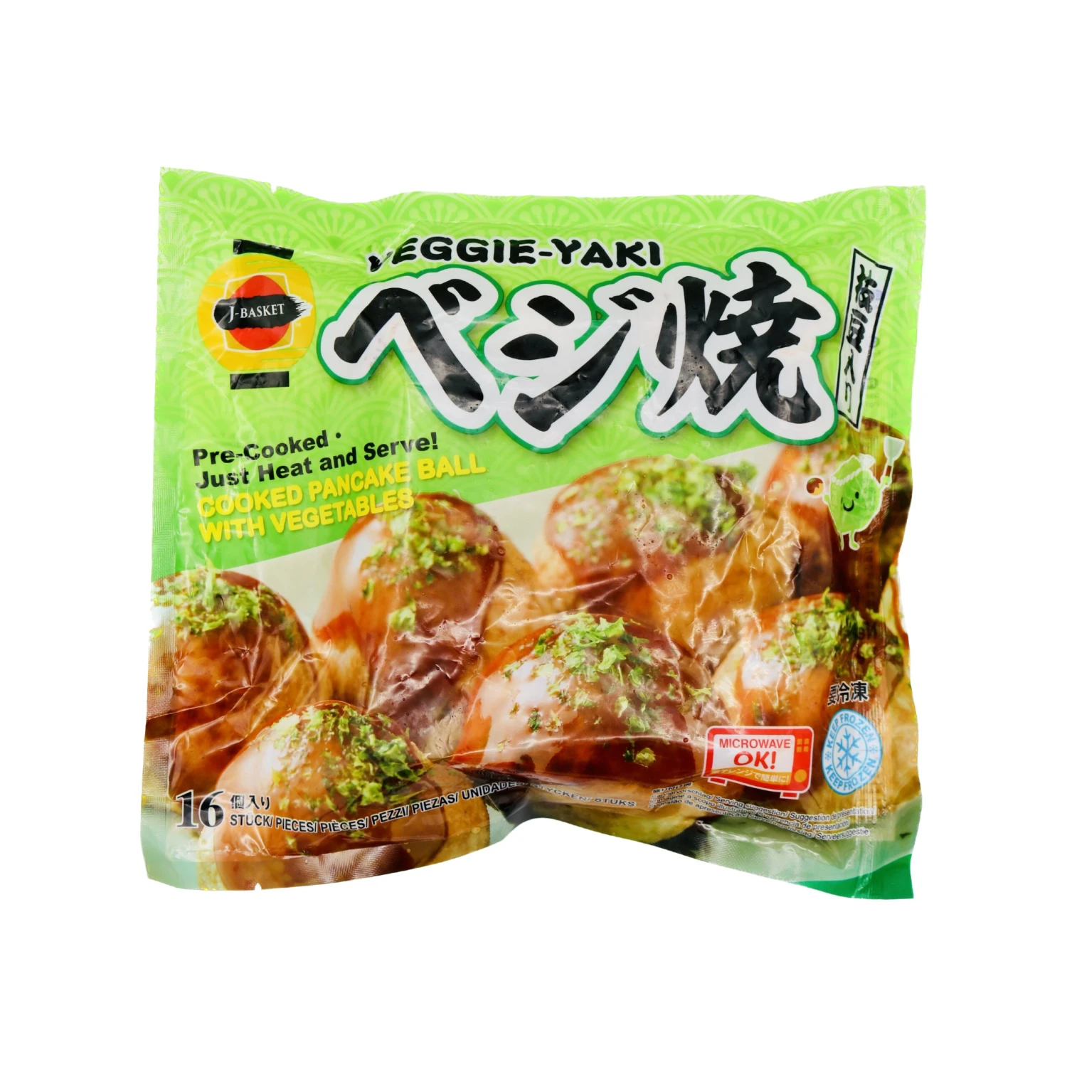 Description: J-Basket Veggie-Yaki (30g*16Pcs) 480g (Frozen). A packet of frozen cooked pancake balls with vegetables, perfect to cook in the microwave and enjoy as starters!